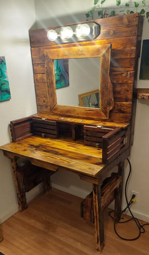 The sky is the limit, really. We break down pallets and turn them into something cool for you. From vanities and coffin shaped book shelves, to tiny children’s picnic benches, using only the finest pallets of course.